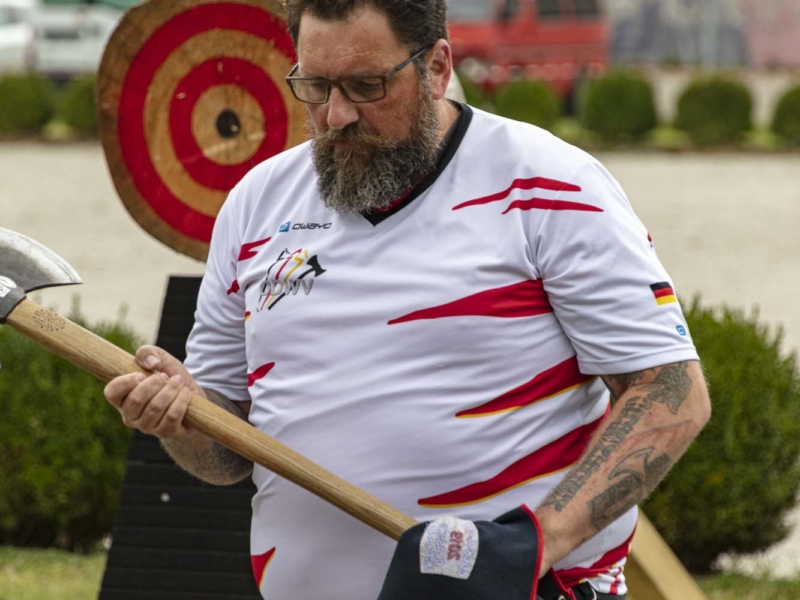 Simon Eglin von Regio aktuell bei den Doppelaxtwerfern